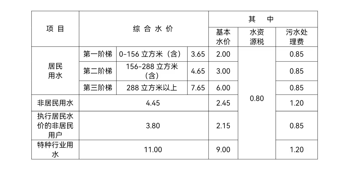 根據(jù)《關(guān)于調(diào)整城市公共供水基本水價(jià)的通知》(章價(jià)發(fā)【2019】1號(hào))文件規(guī)定,我區(qū)城市公共供水范圍內(nèi)自來(lái)水收費(fèi)標(biāo)準(zhǔn)見下表: